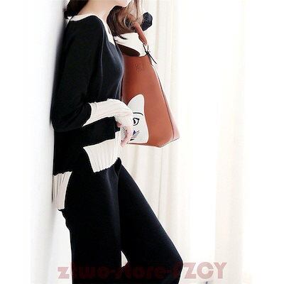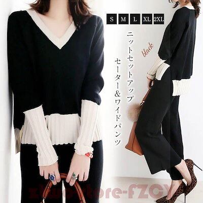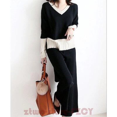 セットアップ レディース リブニットセットアップ パンツセットアップ ニット 秋 冬 上下セット ニットパンツ ニットセーター ガウチョパンツ Vネック ゆったり