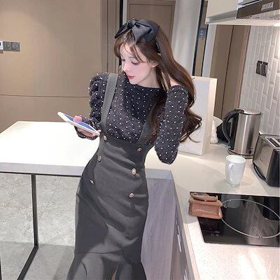 秋冬 着痩せ 2024新作 人気セットアップ サロペットスカート?+水玉模様 トップス プリーツスカート 二点セット
