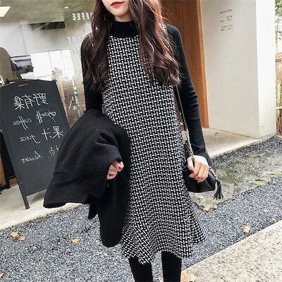 2点セット ニットワンピース レディース セットアップ スカート40代 秋 冬 チェック柄 セーター 長袖トップス 韓国風 通勤 OL オシャレ 上品 体型カバー