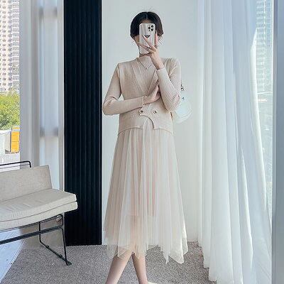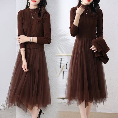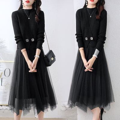 人気商品超目玉 ニットセットアップ 2点セット レディース 春秋 秋冬 ニット セーター クロス 長袖 フレアスワンピース ミモレ丈 ワンピース ロングワンピース き