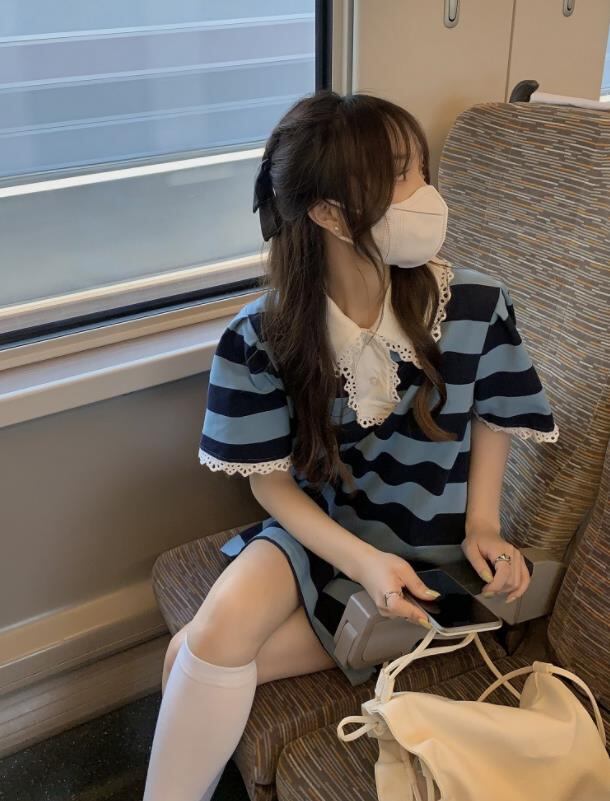 2022春夏新作 女 レディース ハイウエスト 半袖 ボーダー柄 ミニ ワンピース ドレス 台型スカート