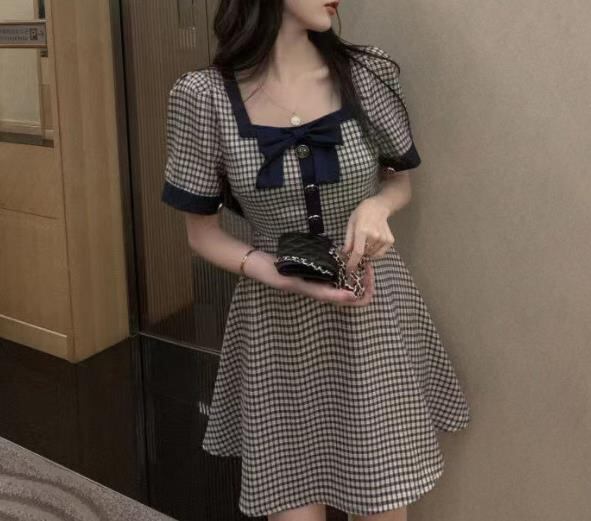 2022春夏新作 女 レディース ハイウエスト 半袖 チェック柄 ミニ ワンピース ドレス 台型スカート S-2XL