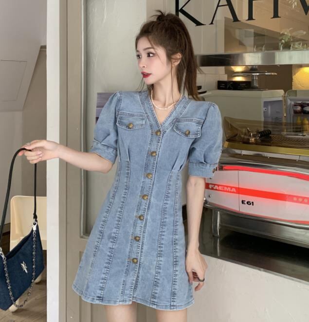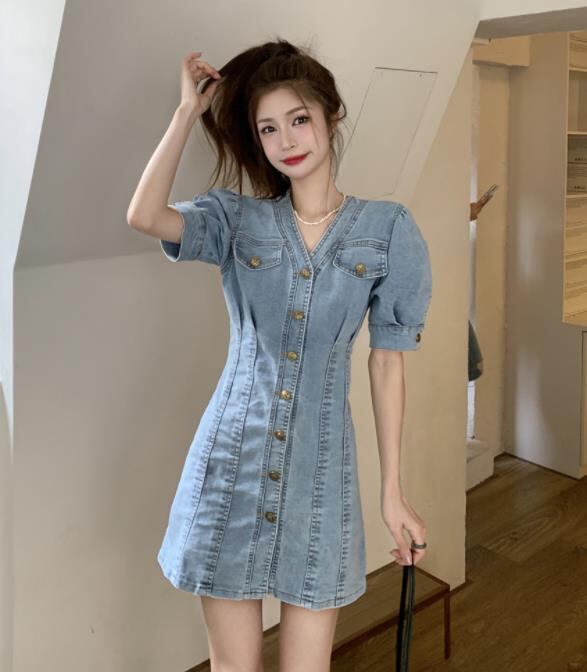 春夏新作 女 レディース ハイウエスト 半袖 Vネック デニム ミニ ワンピース ドレス タイトスカート