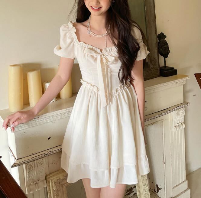 春夏新作 女 レディース ハイウエスト 半袖 無地 パフスリーブ ミニ ワンピース ドレス 台型スカート