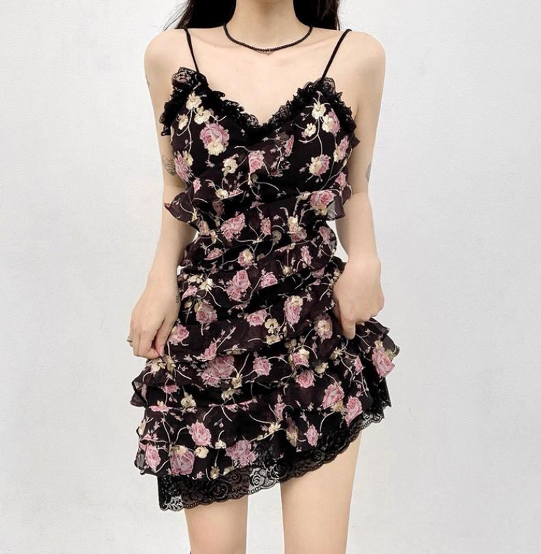 春夏新作 女 レディース ハイウエスト 袖なし 花柄 吊りスカート ミニ ワンピース ドレス 台型スカート