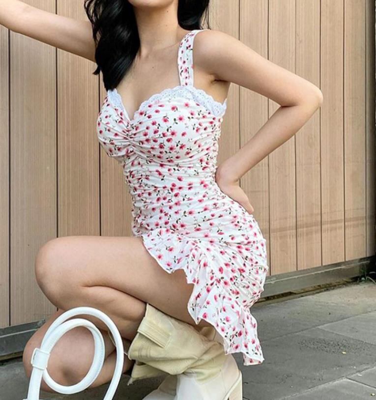 春夏新作 女 レディース ハイウエスト 袖なし 花柄 吊りスカート ミニ ワンピース ドレス タイトスカート