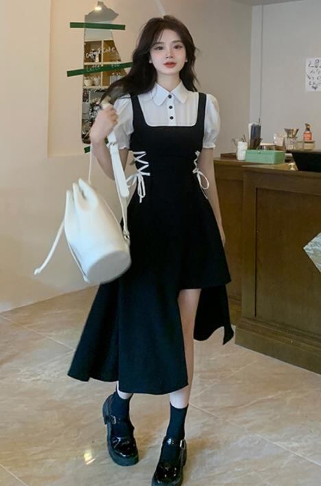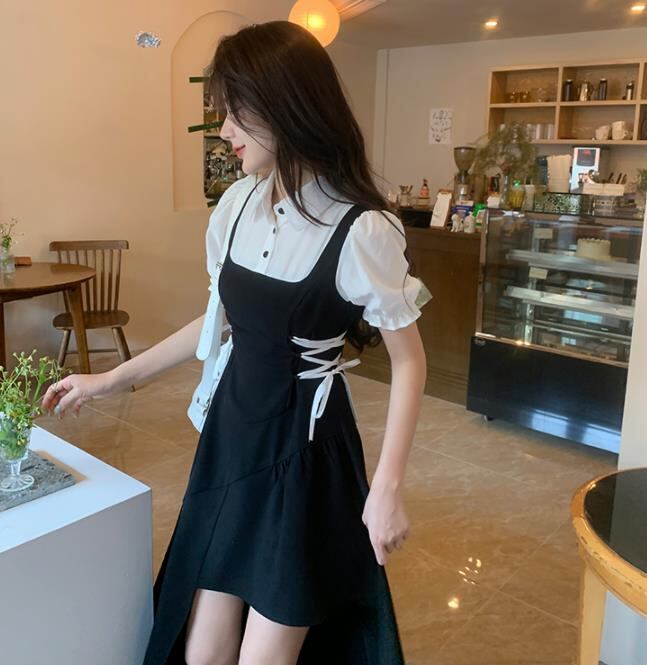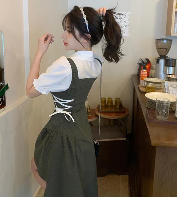 2022春夏新作 女 レディース ハイウエスト 半袖 ロング ワンピース 台型スカート 2色 S-L