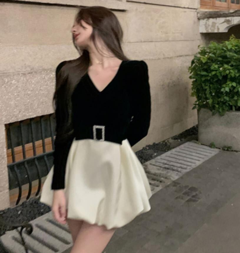 2022春夏新作 女 レディース ハイウエスト 長袖 ミニ ワンピース ドレス 台型スカート S-2XL