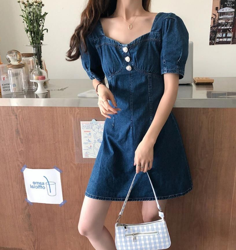 2022春夏新作 女 レディース ハイウエスト 半袖 デニム パフスリーブ ミニ ワンピース ドレス 台型スカート