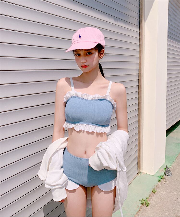 人気のスカイブルー×フリルバンドゥが可愛いビキニ2点セット。