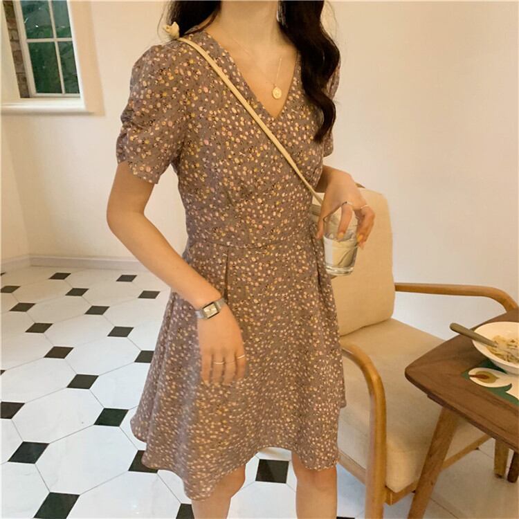 体型カバーと可愛いを両立!スリム Vネック 花柄 半袖 ワンピース sweet系 学生 減齢 気質 小さい新鮮なTREWPL36975125