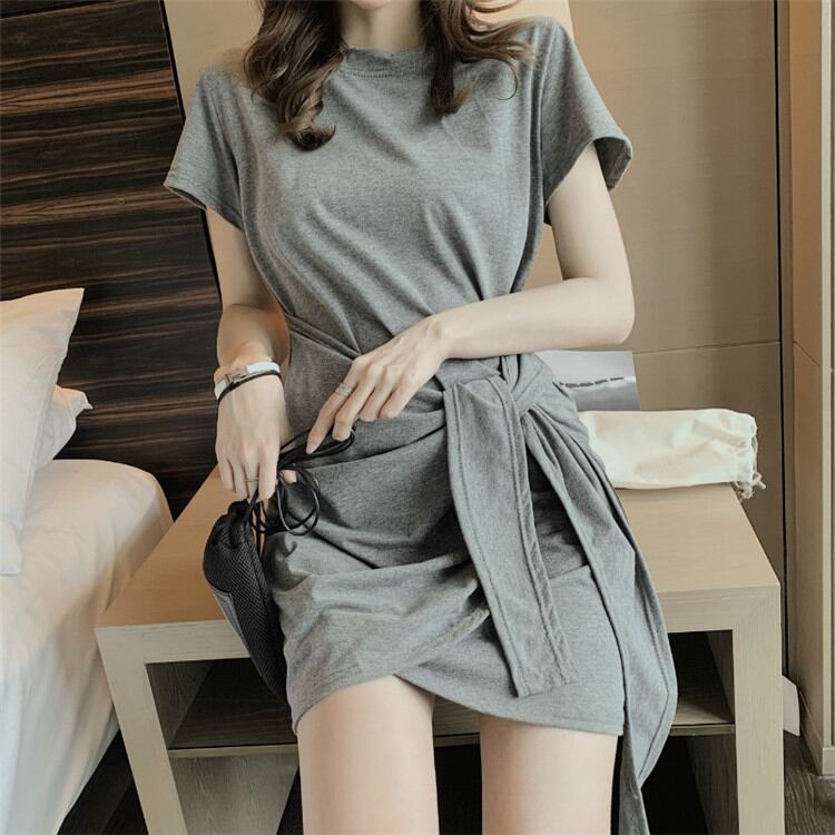 気質 スリム イレギュラー バンディング 半袖 Tシャツワンピ カジュアル オシャレ
