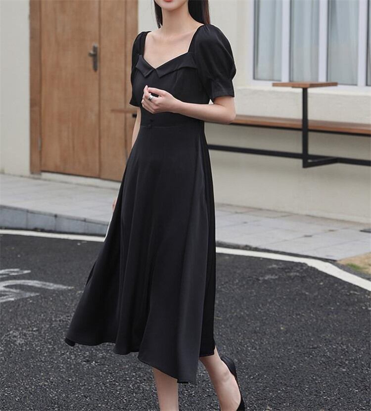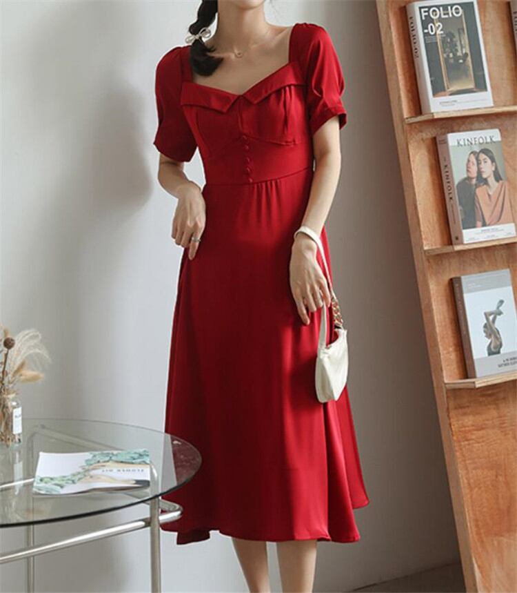 フレンチスタイル ハイエンド 気質 半袖 スクエアネック ワンピース ピュアカラー 夏