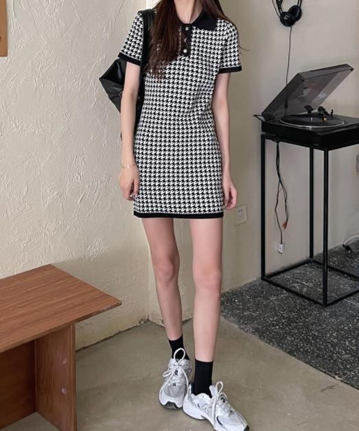 春夏新作 女 レディース ハイウエスト 半袖 千鳥格子 ニット ミニ ワンピース ドレス 台型スカートKJUY5238107