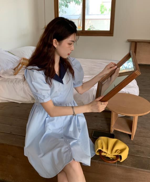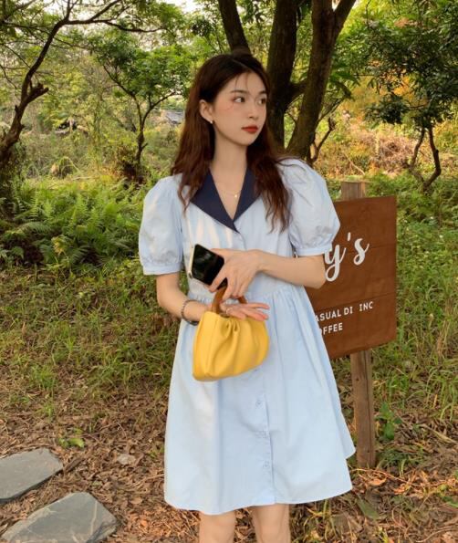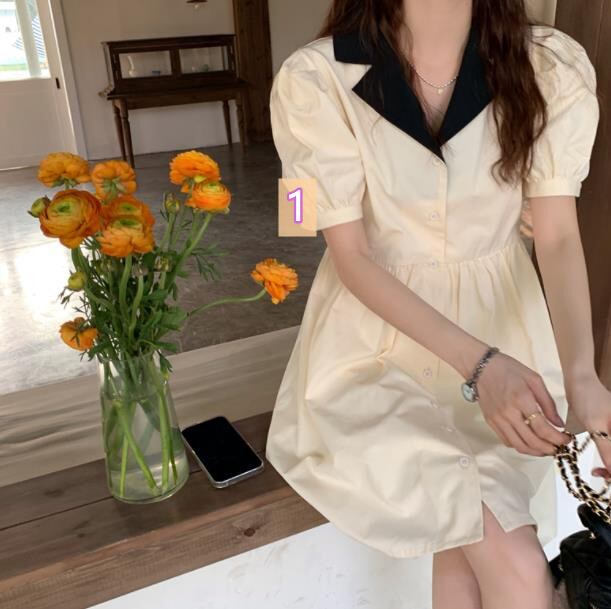 春夏新作 女 レディース ハイウエスト 半袖 パフスリーブ ミニ ワンピース ドレス 台型スカート 2色TYRO452100
