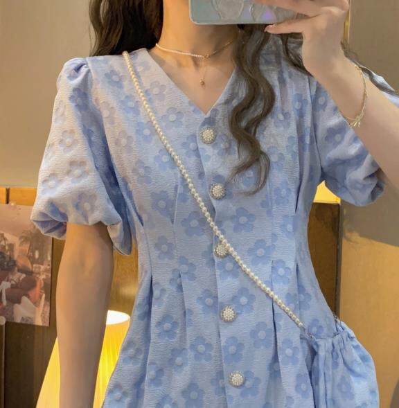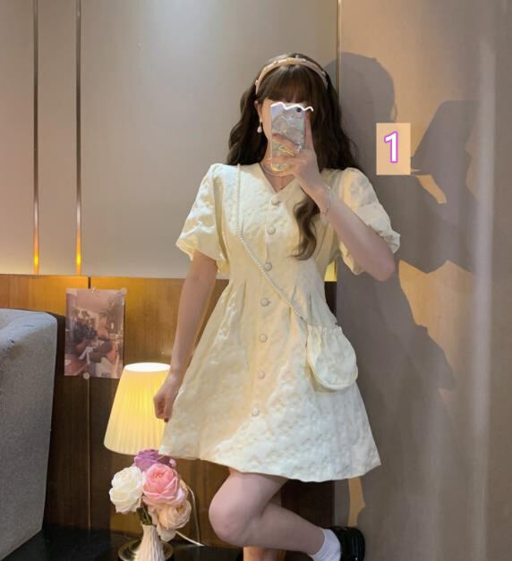 春夏新作 女 レディース ハイウエスト 半袖 パフスリーブ ミニ ワンピース ドレス 台型スカート S/MTYRO452107