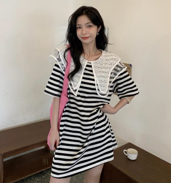 春夏新作 女 レディース ハイウエスト 半袖 ボーダー柄 ミニ ワンピース ドレス 台型スカートTYRO452110