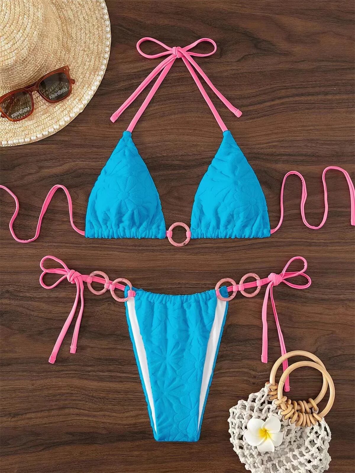 女性の白いコントラストリングリンクされたマイクロ水着、セクシーな三角形のビキニ、クロスオーバーひも水着、ビーチスーツ、サイド、2024 ビキニ Tシャツ T240618232606_02