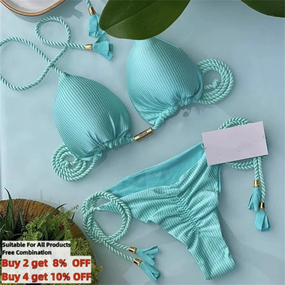 女性用ソリッドカラービキニ,手織りロープ水着,リアタイ水着,ツーピース水着S XL ビキニ セパレート レディース T240618174025_11