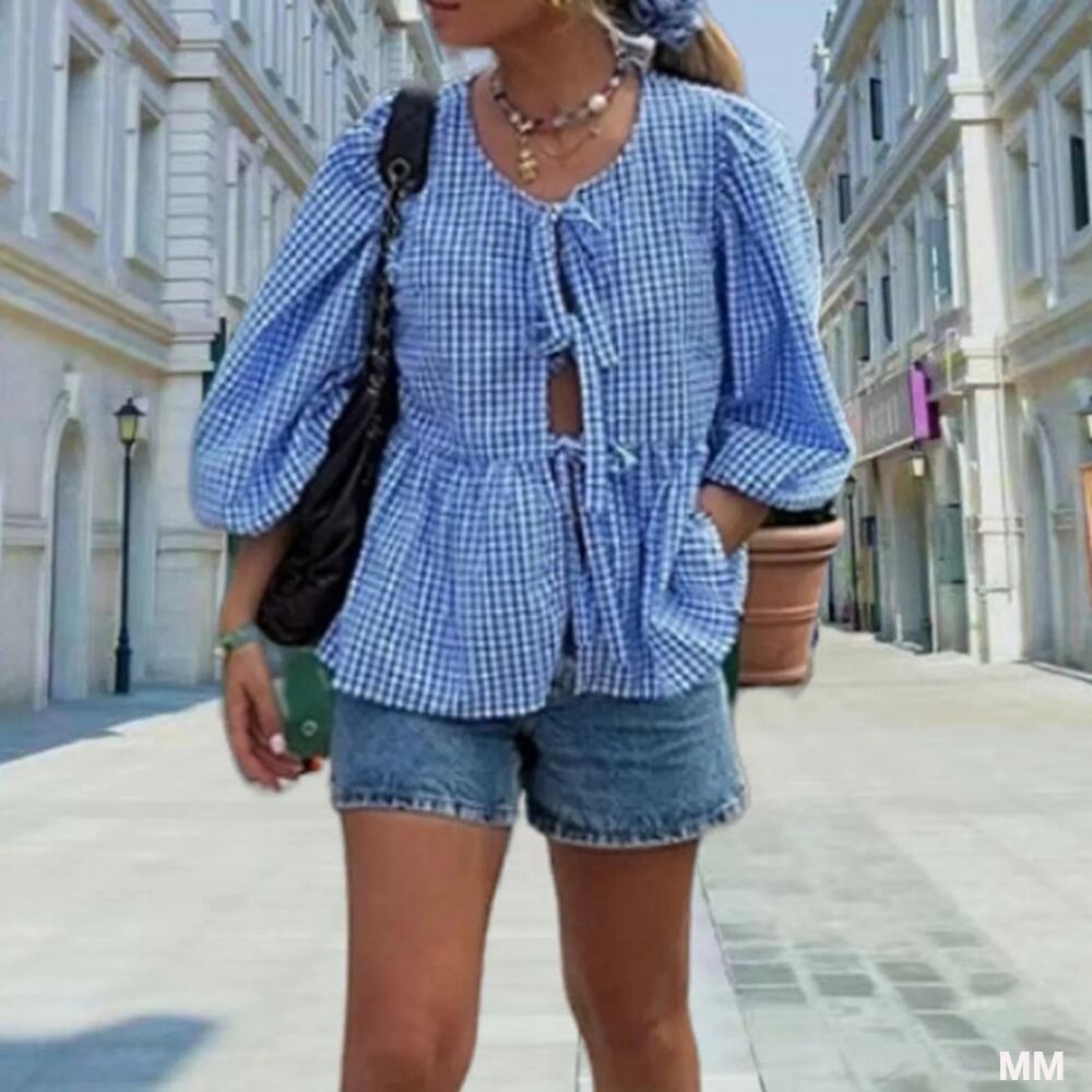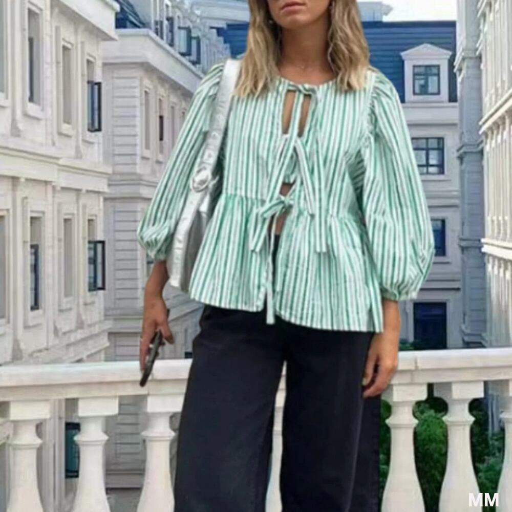 女性用プリントバブルブラウス,半袖,フロントネクタイ,裾,ルーズフィット,ストライプ,新しい春夏コレクション2024 Tシャツ シャツ T240619141353_02