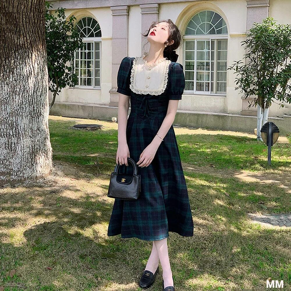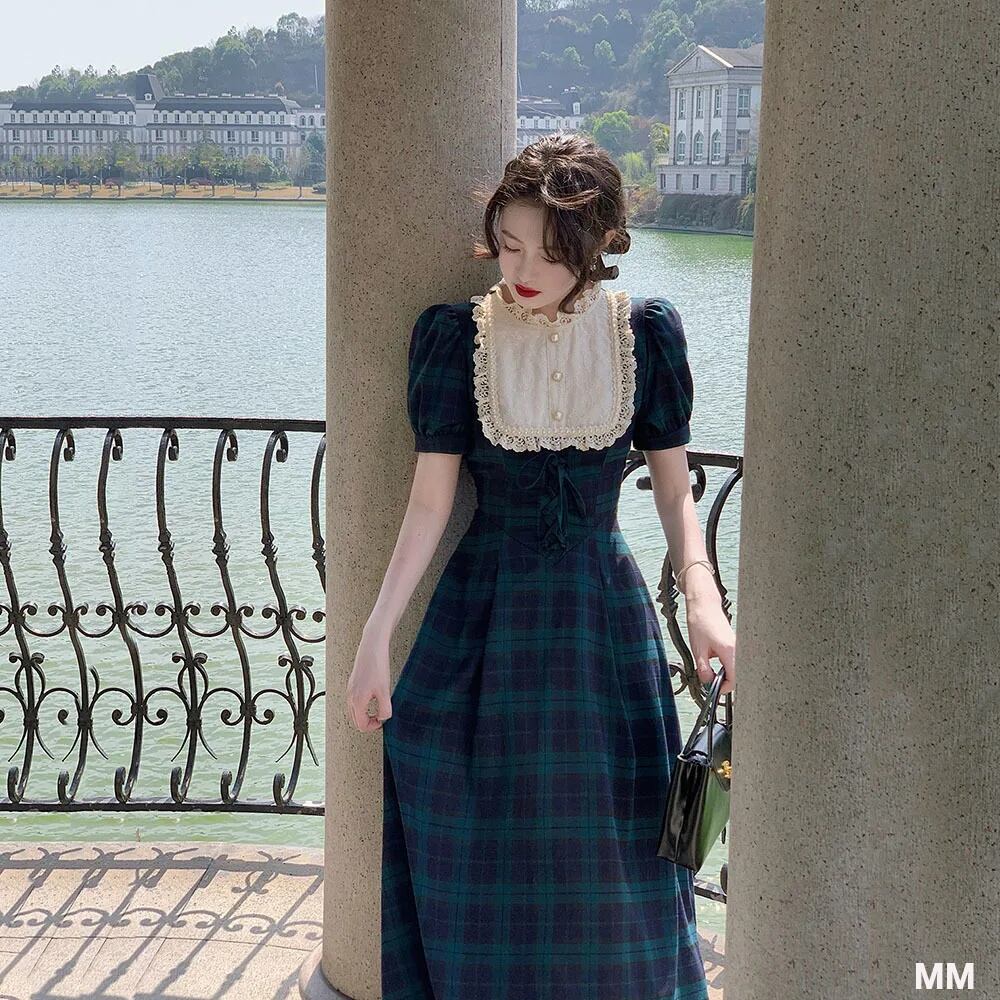 レトロな宮殿スタイルの夏のタータンドレス,チェック柄,韓国スタイル,スリム,半袖,ハイウエスト,プリンセスドレス,2023 韓国系水着 セパレート水着 ワンピース水着 T240626155047_01