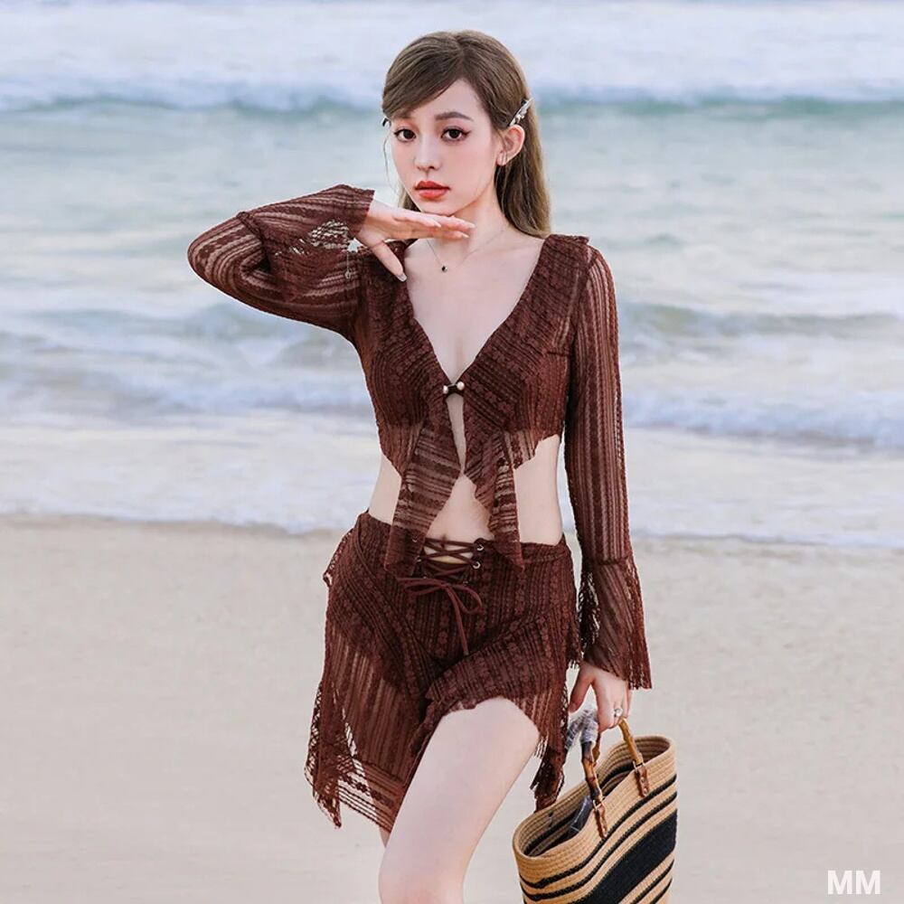 3ピースメッシュ水着セット,カーディガン,ビキニセット,韓国スタイル,ビーチウェア,カバー付きドレス,夏,2024 韓国系水着 セパレート水着 ワンピース水着 T240626160122_03