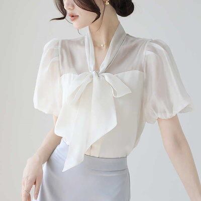 今っぽシアーシャツ 通勤 20代 30代 40代 新職業 レディース フレンチ 感 半袖シャツ2024 新作優しいリボン ス レディース 韓国ファッション