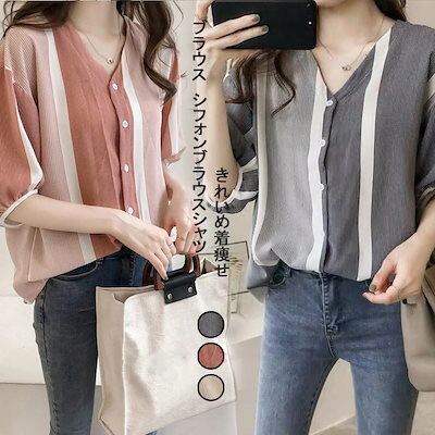 ブラウスレディース可愛い ブラウストップスストライプ柄ブラウス韓国風半袖ブラウスリゾートシャツブラウス 通勤 人気 20代30代40代★1