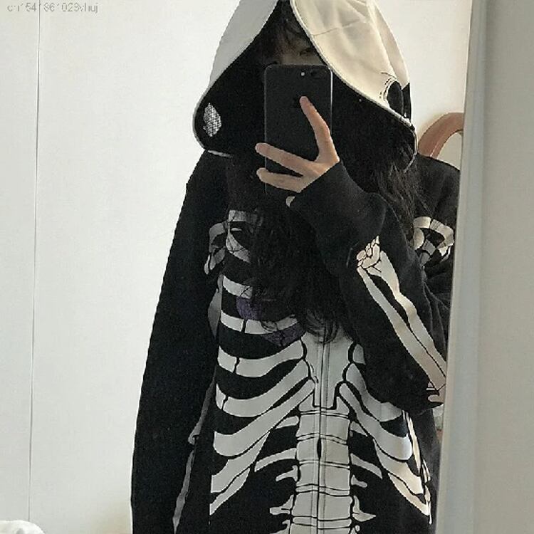 女性の骨格プリントパーカー、黒のカーディガン、ストリートウェア、yk2スタイル、ジップアップフード付きトップス、90年代の服、ヴィンテージスウェットシャツ、y2k