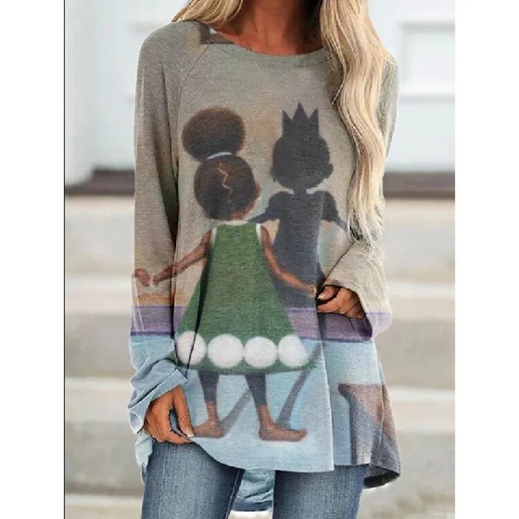 女性用ラウンドカラー長袖Tシャツ,ファッショナブルなプリントトップ,カジュアルスタイル,原宿,ストリートスタイル,ラージサイズ,春