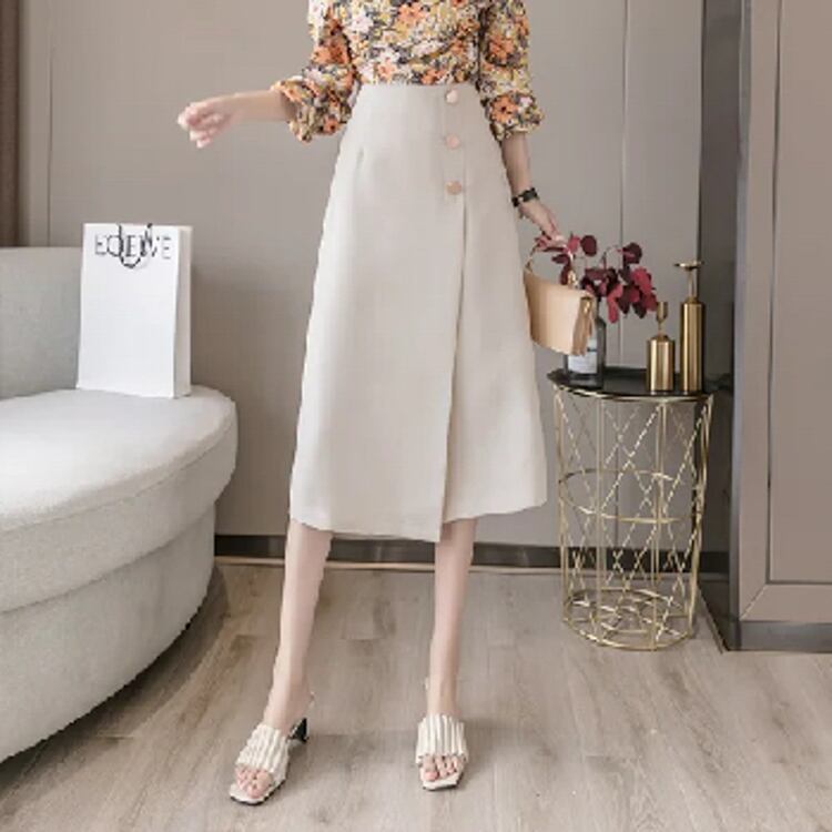 女性のシックな韓国スタイルのスカート,カジュアル/プロのミドル丈ドレス,ハイウエスト,エレガント,無地,ボタン,2023