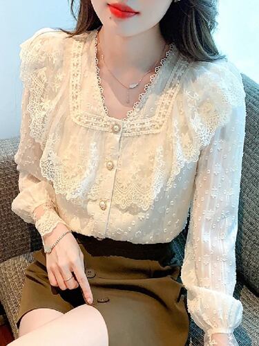 女性用長袖Vネックレースブラウス,フリルシャツ,トップス,秋,g230,2022