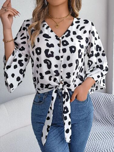 女性用ヒョウ柄Tシャツ,弓付きカジュアルトップ,中央スリーブ,春と夏