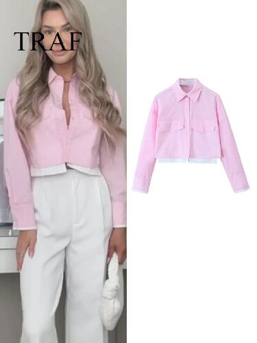 女性のための非常に長い袖のクロップシャツ、女性のためのピンクのパッチワークシャツ、ボタンアップブラウス、ストリートウェアトップス、ファッション、2024