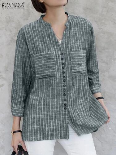 Zanzea-女性用ヴィンテージストライプブラウス、3/4スリーブ、ルーズシャツ、ファッションVネック、ボタンアップトップス、エレガントなチュニック、夏