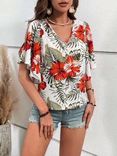 女性のエレガントな植物プリントくり抜かれたシャツ、ヨーロッパとアメリカのクロスボーダー、ファッショナブル