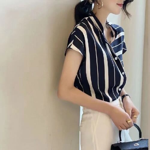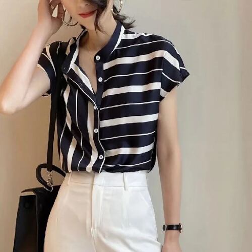 女性用半袖ストライプトップ,不規則なブラウス,シャツ,ハイカラー,だぶだぶ,サマーファッション,mm0289