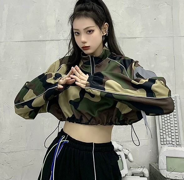 スウェット トレーナー ショット丈 長袖 バイカラー 体型カバー 着痩せ 迷彩 ミリタリー カジュアル