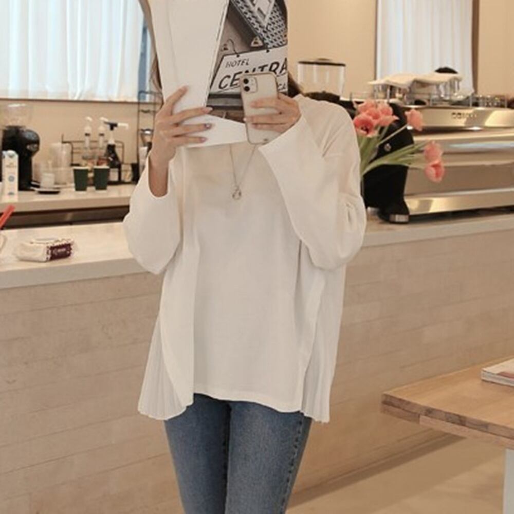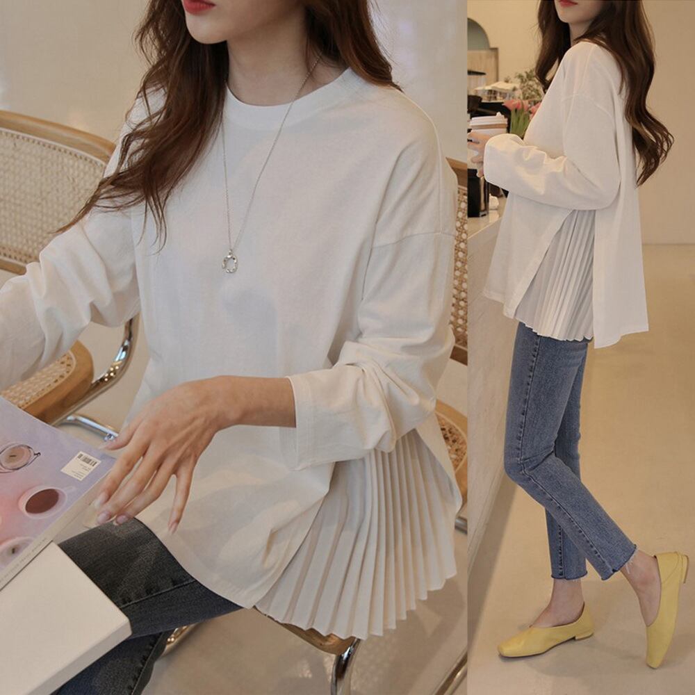 2021秋新作 異素材MIX Tシャツ プリーツtシャツ スリット 長袖 レディース 韓国ファッション
