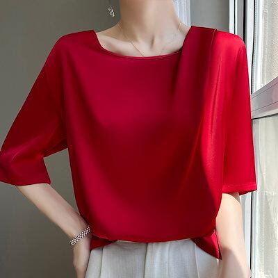 シアーシャツ 即納 日韓国ファッション 高級感 サテン ブラウス 大人気質 百掛け 通勤半袖 tシャツ レディースアイスシルク半袖トップス 通勤Tシャツシフォンブラウス