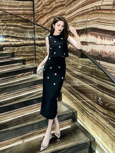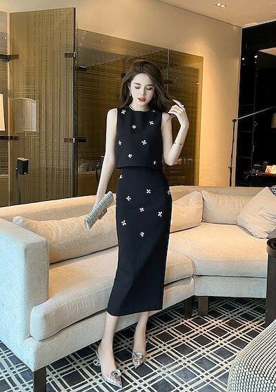 【JY.上品】 夏 上下セット ダイヤモンド飾り ハイウエスト ベスト+スカート パーティードレス キャバ 着痩せ 大人 同窓会 披露宴 卒業式 結婚式 演奏会 ウェディング 二次会 発表会