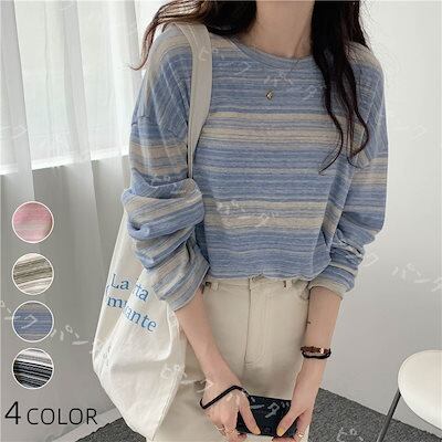 無料【2024秋新入荷】 人気流行りストライプ長袖Tシャツ 設計感韓国ファッション 長袖スウェットトップスレディース ゆったり 百掛け 学生長袖 初秋薄 アンダーウェアインナー