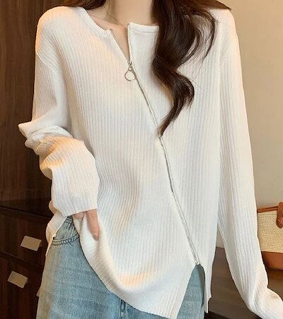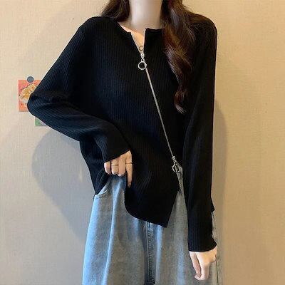 秋 大きいサイズ 長袖tシャツ レディース 設計感ファスナー 長袖トップス イレギュラー 百掛け アンダーウェア ゆったり 着痩せ韓国ファッションスウェット