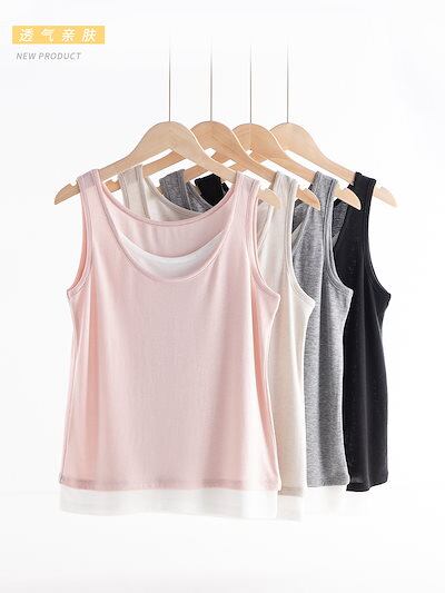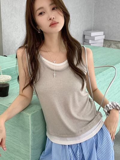 夏 肌着 柔らかい キャミソール レディース 通気冷感 Tシャツノースリーブトップス フェイクレイヤード ゆったり百掛け キャミソール インナーおしゃれヨガウェア 韓国ファッション