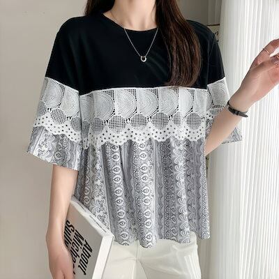 夏 日韓国ファッション tシャツ 半袖 レディース レトロ 花柄レース切り替え Tシャツカットソー ゆったり 百掛け 半袖トップス カジュアル 可愛い