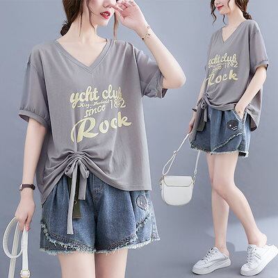 夏服 大きいサイズ Tシャツ 韓国ファッション ゆったり百掛け 半袖トップス ドローストリングプリーツ設計 シャツ 半袖 レディース薄手 Vネック 着痩せ Tシャツカットソー