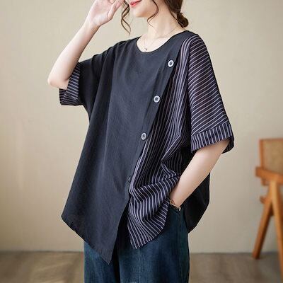夏新作 大きいサイズ 夏服 ゆったり tシャツ 半袖 レディース 怠惰な風 薄手 カジュアル綿麻Tシャツカットソーおしゃれ 百掛け 半袖 トップス 色切り替え ブラウス