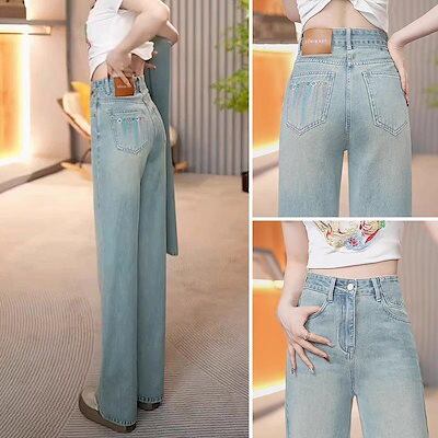 2024夏ワイドレッグジーンズレディースナローバージョン多用途ポケット刺繍デザイン韓国風ストレートパンツ