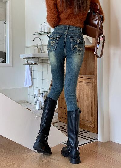 ジーンズ スキニーパンツ デニムパンツ ストレッチ gパン ハイウエスト 刺繍 着痩せ ボトムス レディース 春 夏 秋 カジュアル ファッション