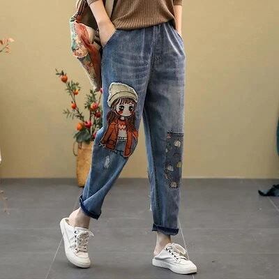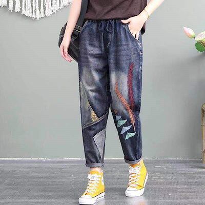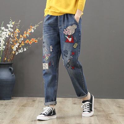 漫画ガール ワッペン 刺繍 ジーンズ レディース ゆったり 大きいサイズ ビッグポケット ウエストゴム ハーレムパンツ